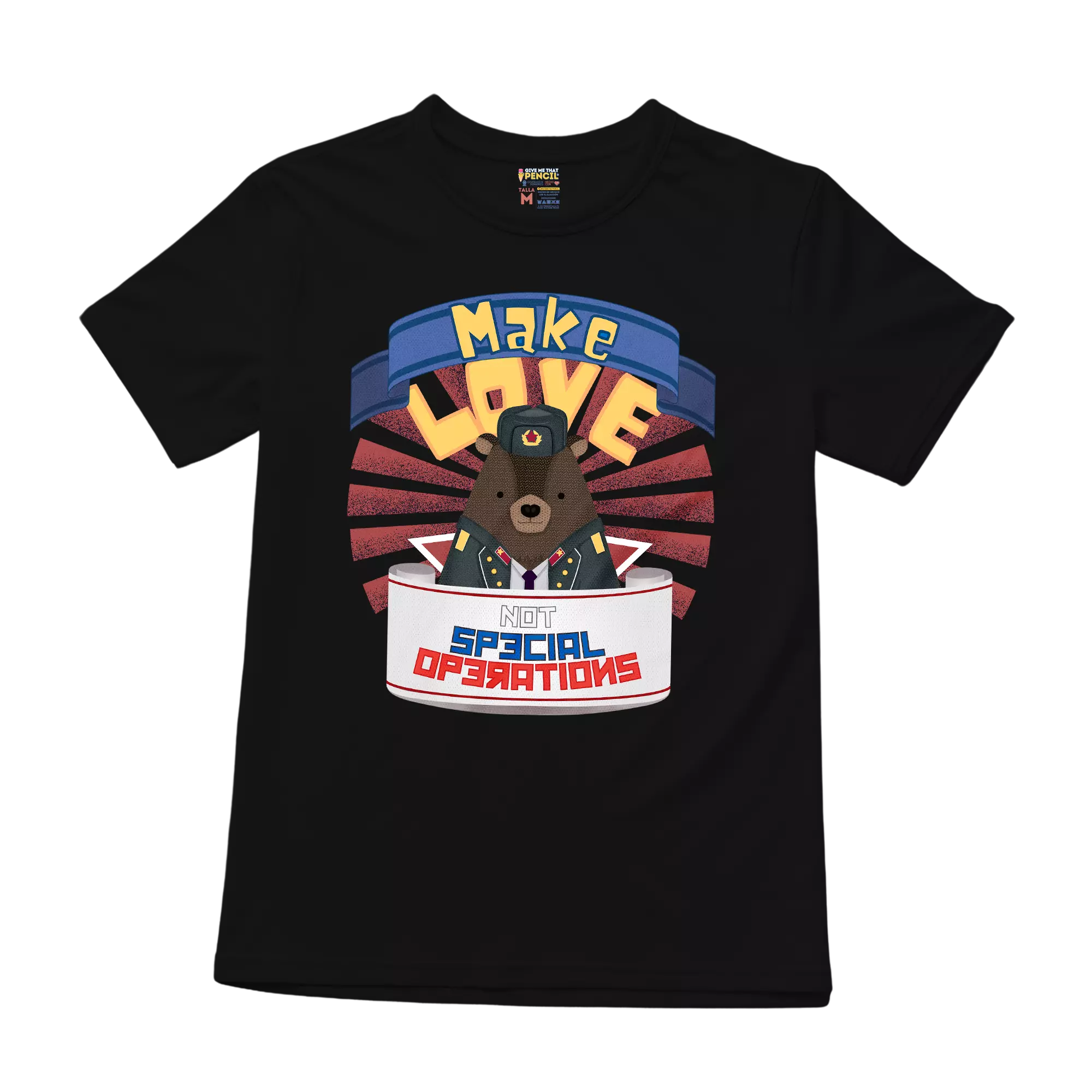 Un mensaje pacifista con un giro inesperado. Este oso con uniforme militar prefiere repartir amor en lugar de operaciones especiales. Ideal para quienes creen en la paz con un toque de humor.