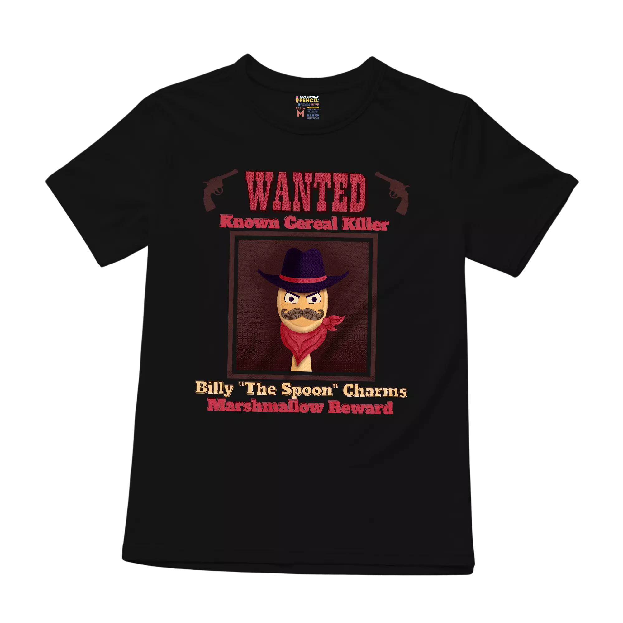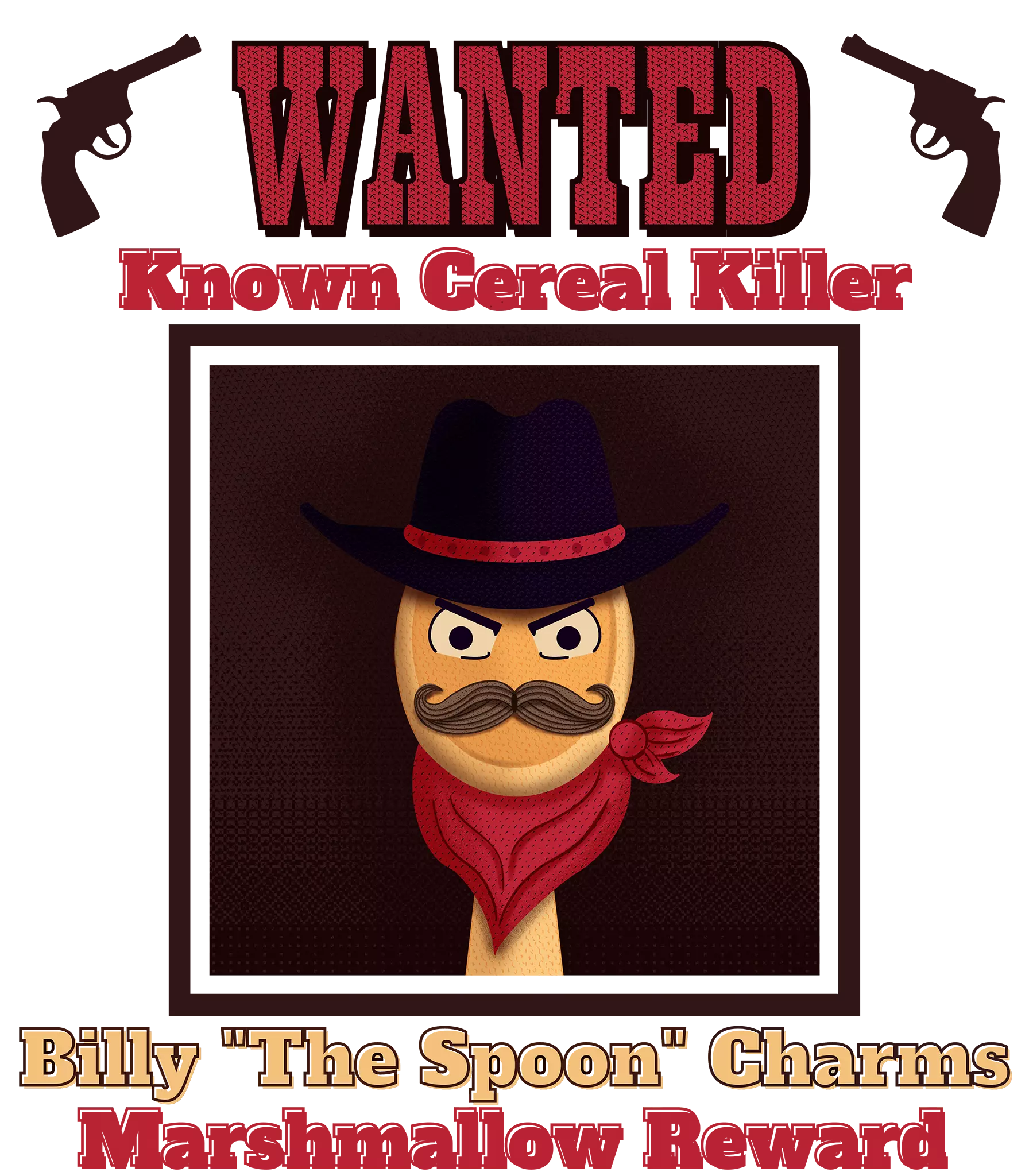 Un vaquero con cuchara en mano y un historial delictivo en el desayuno. Perfecto para quienes toman su cereal con seriedad y un toque de humor matutino.