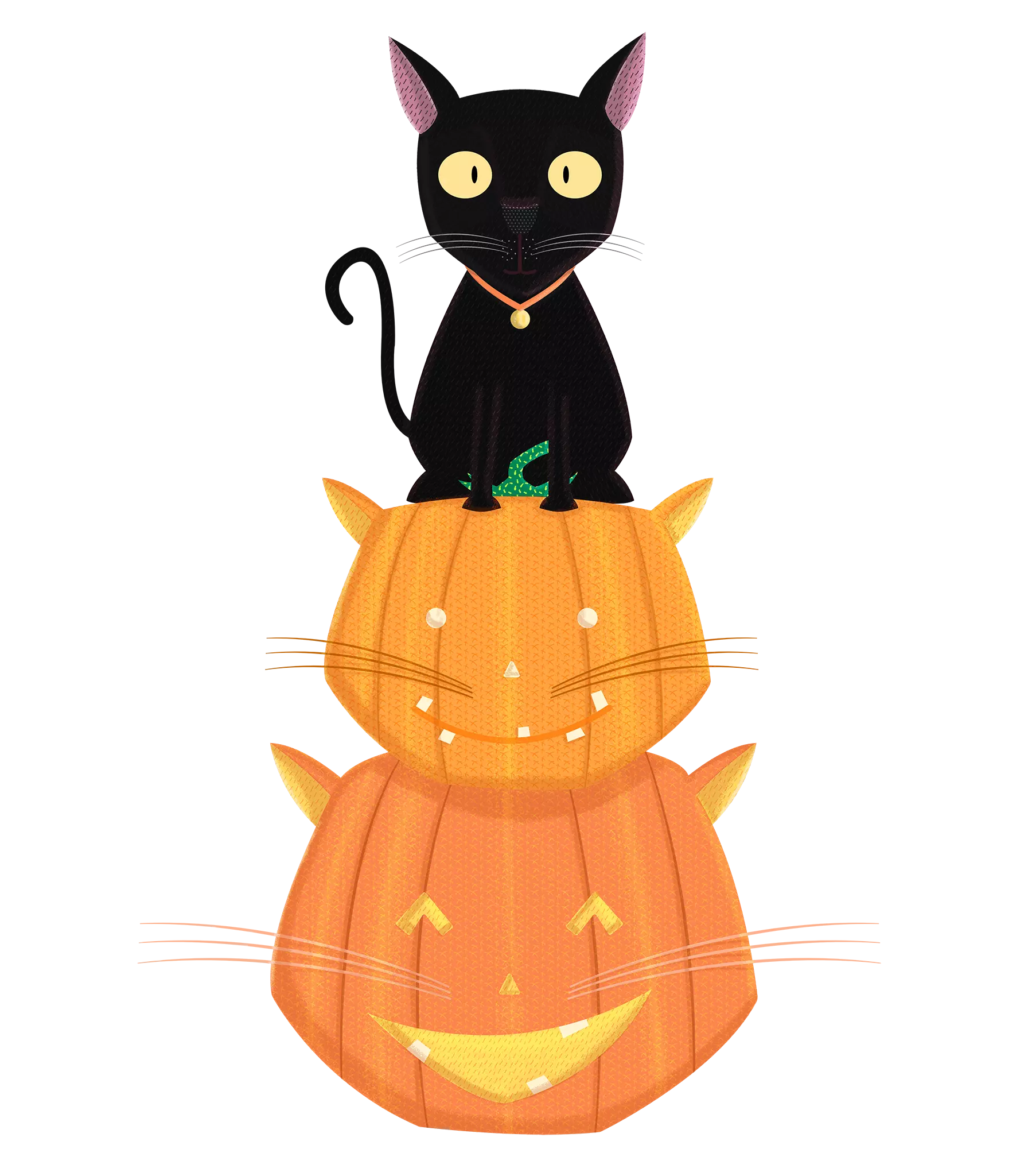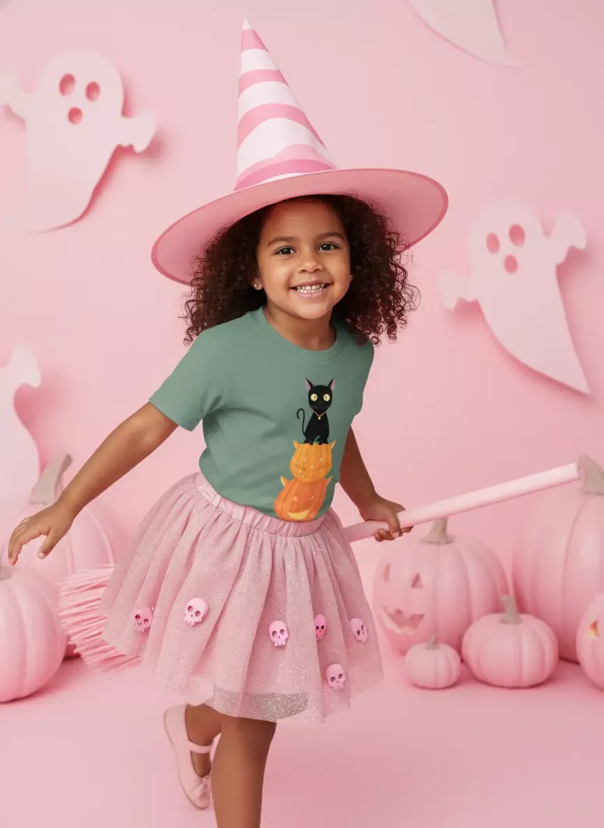 Un gato negro misterioso sobre dos calabazas con cara de felino. Si amas Halloween y los gatos, este diseño espeluznante es perfecto para ti. ¡Dale un toque místico a tu look!