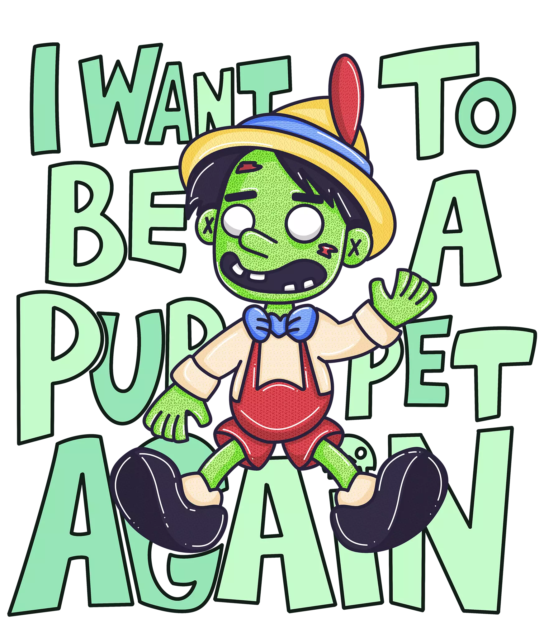 Un Pinocho zombi que solo quiere volver a ser un títere de verdad. Con un toque de humor oscuro, este diseño es perfecto para los fanáticos de cuentos clásicos con un giro espeluznante. Si te gustan las historias con un lado macabro, "Quiero ser un títere otra vez" es ideal para ti.