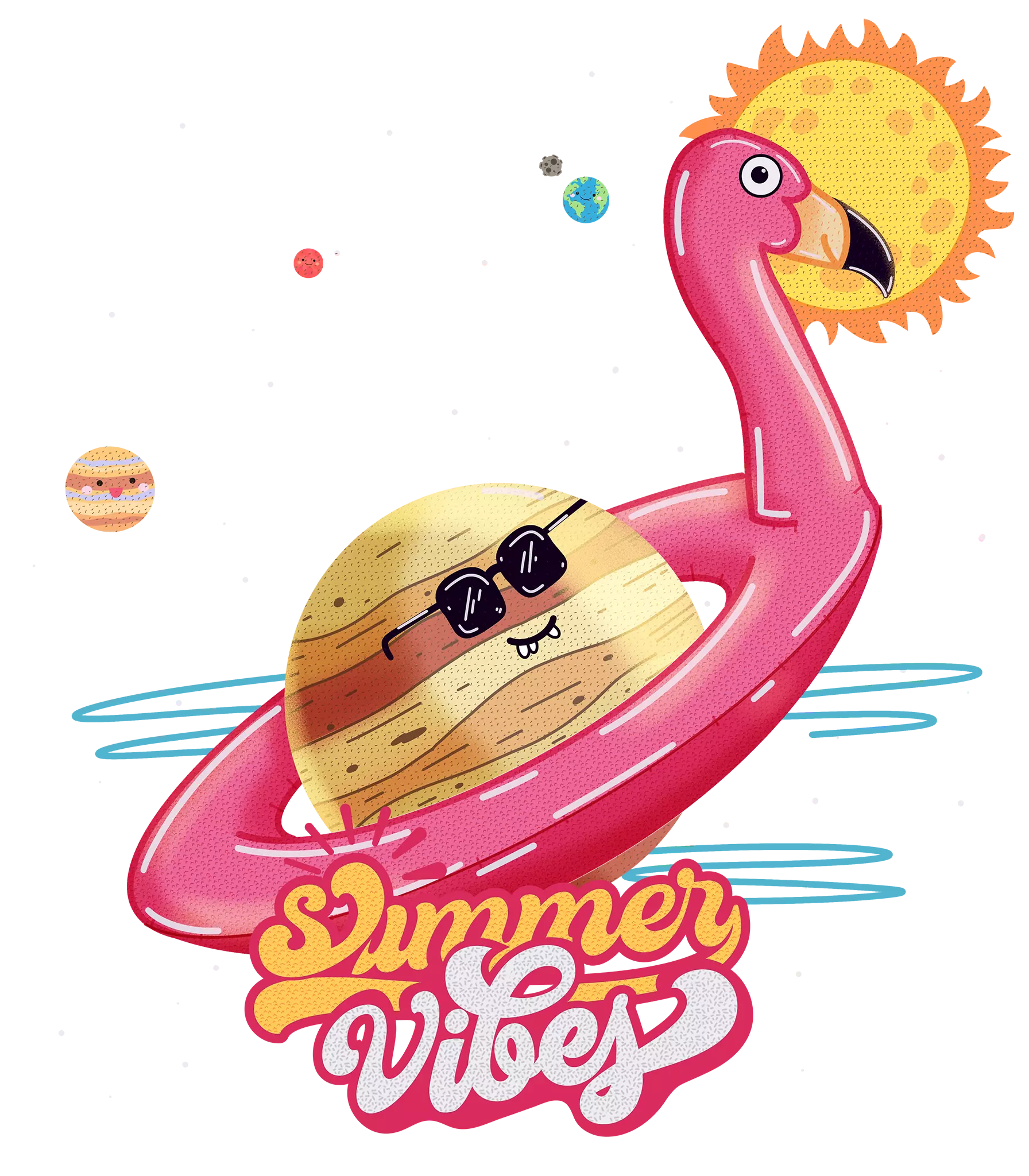 Cuando los planetas también necesitan vacaciones. Saturno flotando en un inflable de flamenco es la imagen definitiva del descanso cósmico.