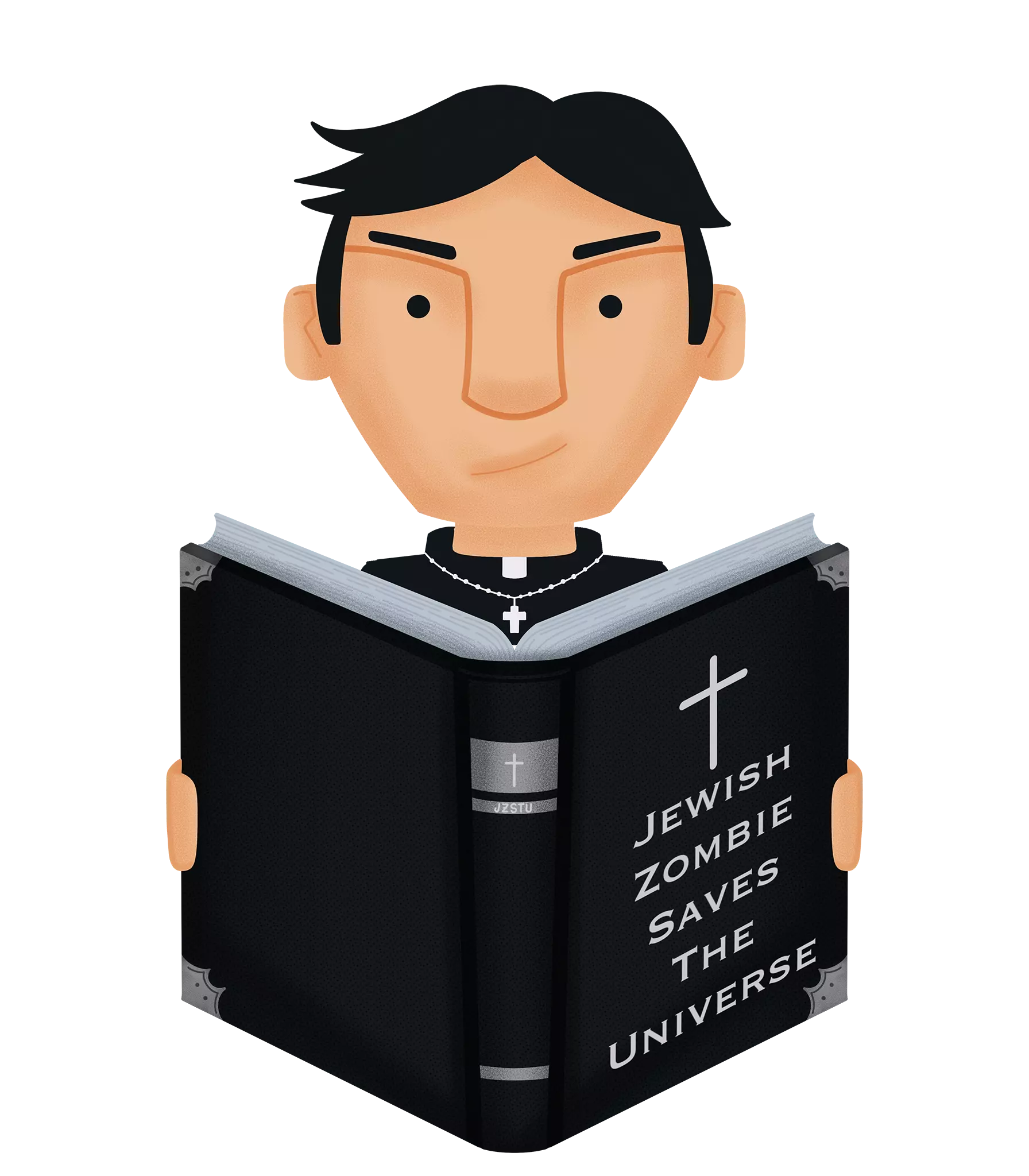 Un sacerdote descubre un libro con una historia peculiar. Un guiño satírico para quienes disfrutan el humor negro y las referencias inesperadas.